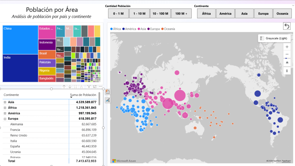 Para ello se ha implementado una tabla jerárquica (matriz) que parte del nivel de continente y permite descender hasta el detalle por país. Este diseño jerárquico no es casual, ya que responde a la necesidad de ofrecer una lectura multinivel de los datos. A nivel agregado, el usuario puede comparar fácilmente continentes entre sí y entender cuáles concentran mayor volumen de población. Al descender al detalle, se hace posible identificar qué países son responsables de ese peso demográfico dentro de cada región. La navegación mediante drill-down y drill-up aporta una experiencia analítica natural, donde el usuario controla el nivel de profundidad de la información que desea explorar.