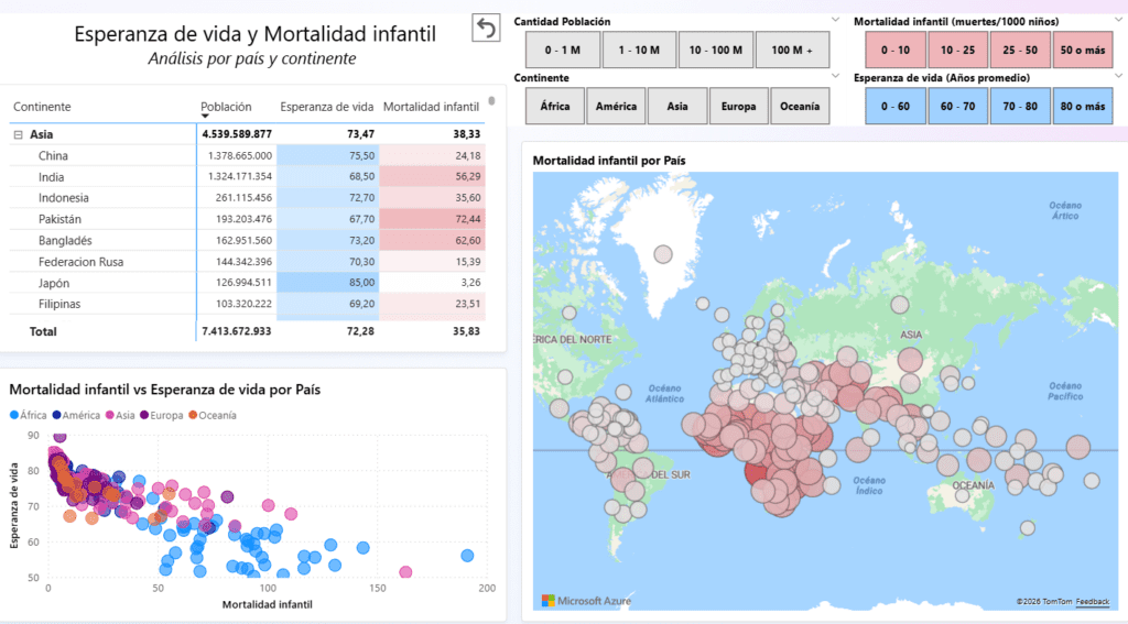 La presencia de estos filtros transforma el informe en una herramienta de análisis interactivo en lugar de una simple visualización estática. El usuario puede aislar regiones concretas, centrarse en países con características similares, analizar únicamente aquellos con determinados niveles de población o estudiar subconjuntos específicos en función de los indicadores de salud.