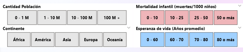 Un elemento clave en el diseño del dashboard ha sido la incorporación de segmentadores que permiten al usuario filtrar dinámicamente la información. Estos segmentadores incluyen filtros por país, rangos de población, esperanza de vida y mortalidad infantil.