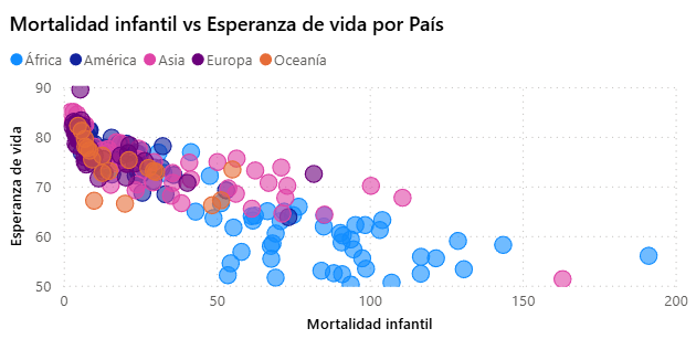 El elemento central de esta página es un gráfico de dispersión en el que cada punto representa un país. En el eje horizontal se sitúa la esperanza de vida y en el eje vertical la mortalidad infantil. Esta elección de visualización responde a la necesidad de analizar la relación entre dos variables cuantitativas de forma clara y directa.