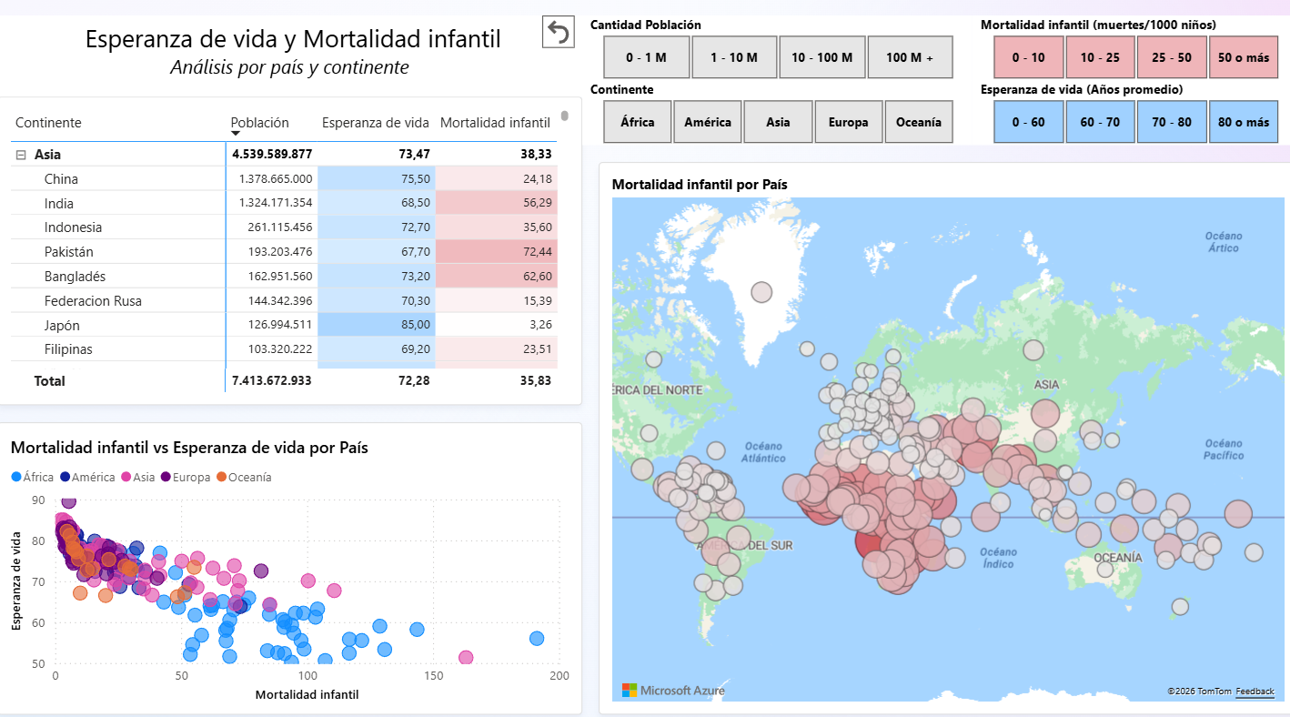 En este proyecto se ha diseñado y desarrollado un dashboard analítico en Power BI con el objetivo de estudiar, desde una perspectiva general, la distribución de la población mundial (tamaño) y analizar la relación entre dos indicadores demográficos: la esperanza de vida y la mortalidad infantil. Más allá de la simple representación gráfica de datos, el enfoque del trabajo ha estado orientado a construir un entorno que favorezca el análisis exploratorio, la detección de patrones y la comprensión de relaciones que, a través de datos tabulares, resultarían mucho menos evidentes.